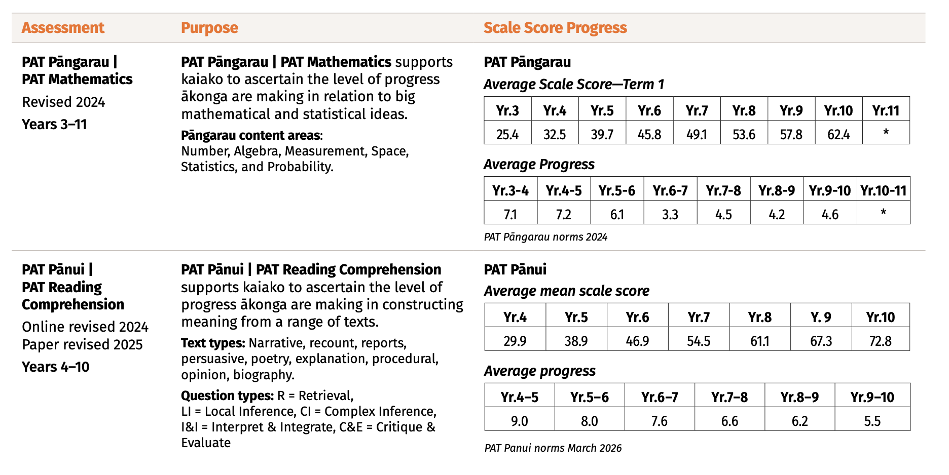 Top Table: Average scale positions at the beginning of each year - make links to the NZC E.G. Yr 5 Maths - 39.7 equates with early Level 3