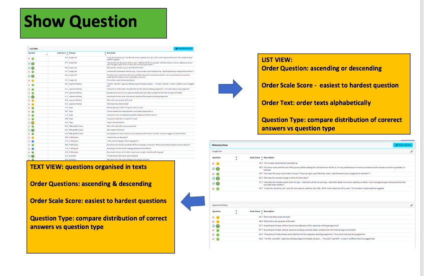 - Show List View : order for scale difficulty of questions, order numerically, group questions by text type