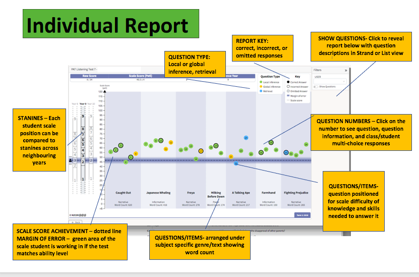 The Individual Report displays the questions against the PAT:Reading Comprehension scale (patc). The questions are grouped according to the genre/text they are associated with. The questions are positioned according to their location on the PAT:Reading Comprehension scale, determined by the level of skill and knowledge required to answer them. The Report Key explains student responses:
